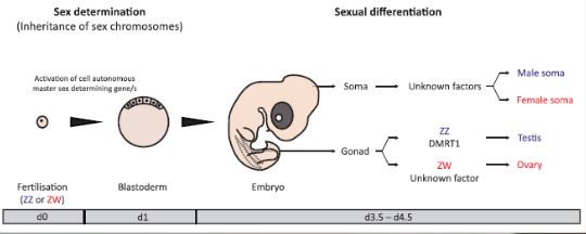 La determinación del sexo ocurre en el embrión temprano (E0-E2) en una célula. de manera autónoma y se rige por la herencia de los cromosomas sexuales. Diferenciación sexual de tejidos como el soma y las gónadas. luego ocurre a medida que avanza el desarrollo. La diferenciación sexual gonadal en los machos ZZ involucra el gen Dmrt1, mientras que la diferenciación sexual femenina maestra El gen sigue siendo desconocido. Debido a que la diferenciación sexual es, al menos en parte, autónoma de las células, otros procesos ligados al sexo actualmente no identificados. Los genes pueden controlar la diferenciación sexual en el cerebro y otros tejidos somáticos.